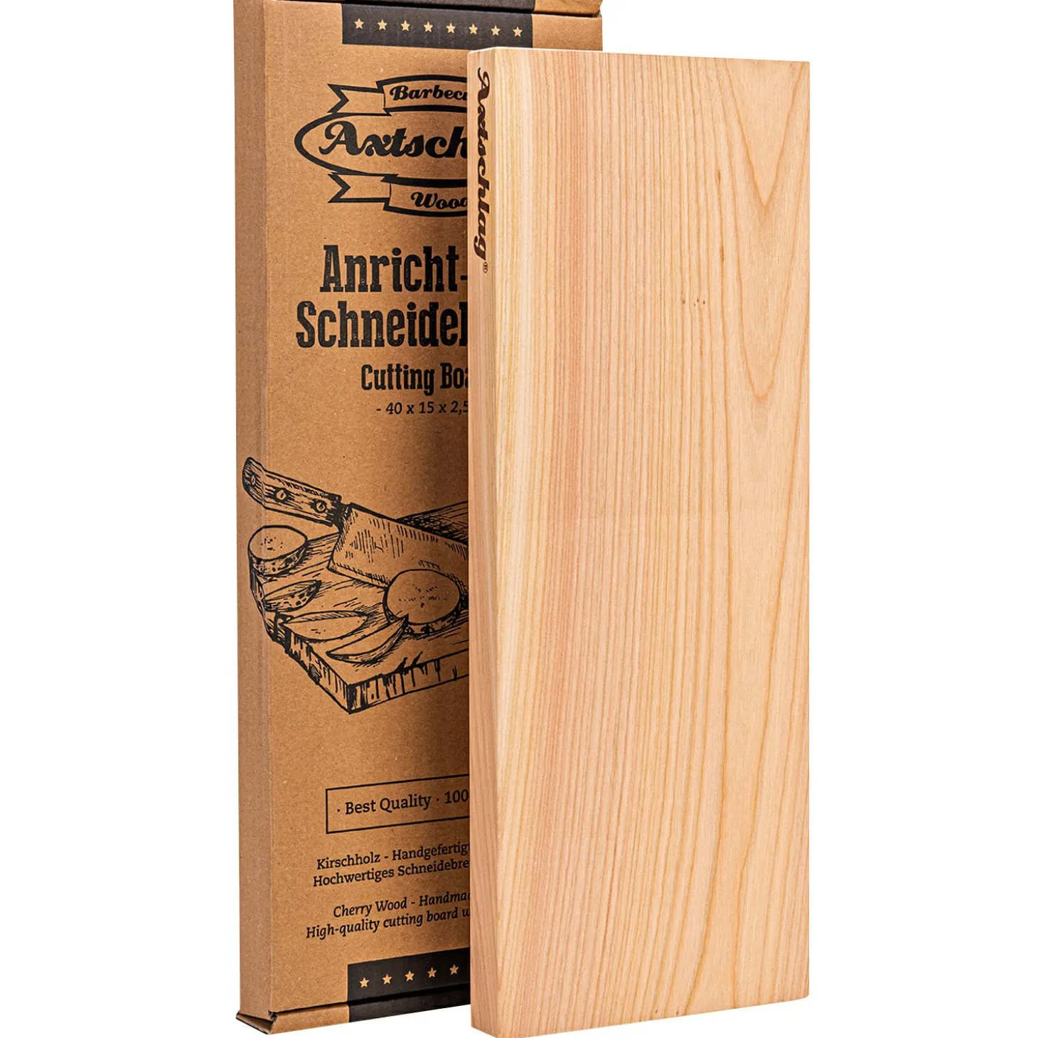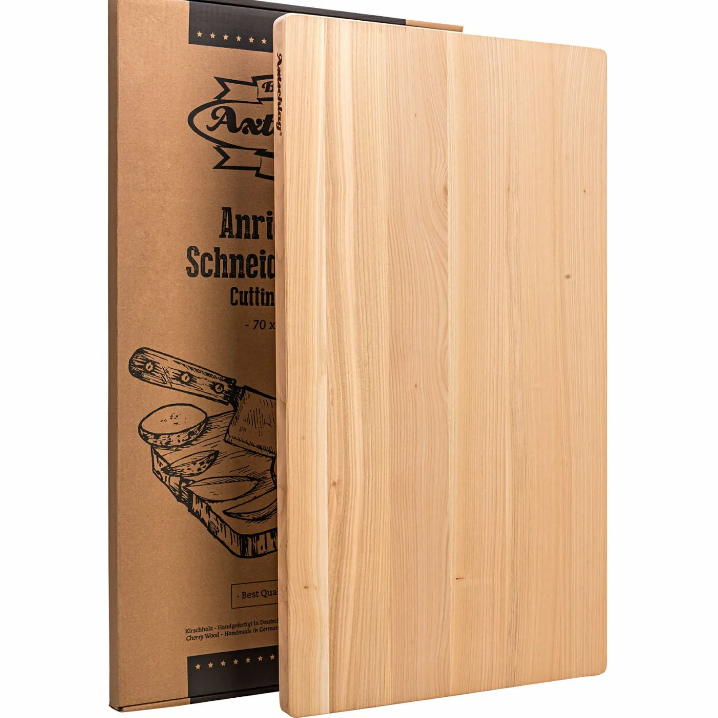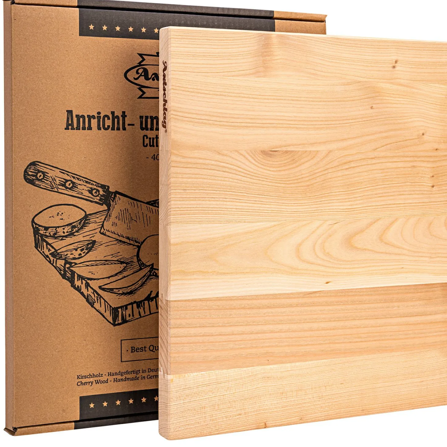 Das Arbeitsbrett ist handgefertigt in Deutschland. Es ist rutschfest sowie besonders massiv und stabil, da es aus einem Stück gefertigt ist. Es wurde bewusst auf eine Saftrinne, in der sich Keime ablagern und die das Reinigen umständlicher macht verzichtet. Dieses Küchenbrett sieht nicht nur gut aus – es ist extra hart aber weicher als Messerklingen. Dadurch bleiben ihre Messer lange scharf. Das 25 mm dicke Kirschholz hält auch starken Schlägen, Hacken und Einweichen stand und splittert nicht. Nach dem Gebrauch einfach mit warmem Wasser und Spülmittel reinigen und aufrechtstehend trocknen lassen. Nicht für die Spülmaschine geeignet.