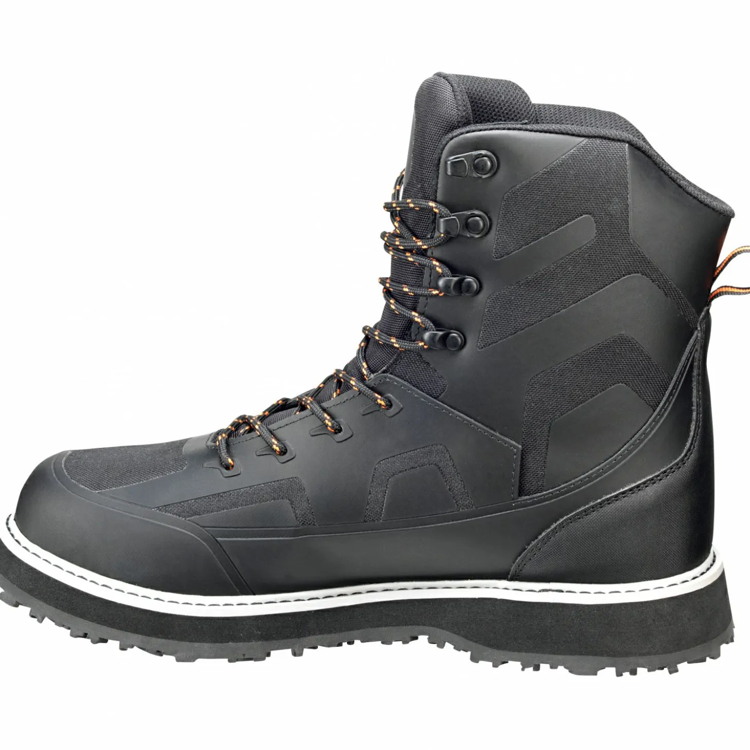 Leichter, robuster Watschuh für Neopren- und atmungsaktive Wathosen. Gepolsterter hoher Schaft, verstärkte Ferse und Zehen für Komfort und Halt. Schnell trocknendes Obermaterial, griffige Gummisohle, dämpfende EVA-Mittelsohle. Korrosionsfreie Schnürösen und Wasserablaufösen. Farbe: schwarz mit orangenen Details.