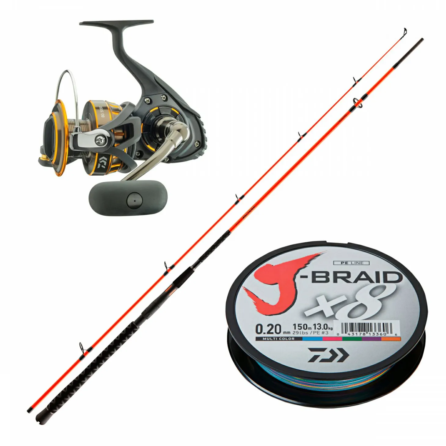 Set bestehend aus 1 x Rolle, 1 x Rute, 1 x Schnur. Rolle: Mit hoher Belastbarkeit und seidenweichen, ruhigen Lauf. 6 Kugellager, Air Rotor, Digigear II Getriebe, Infinite Anti-Reverse Rücklaufsperre, ATD™ Bremssystem, ABS II Aluminiumspule, Twistbuster II Schnurlaufröllchen. Schnurf.: 270 m/Ø 0,30 mm, Übers.: 5,7:1, Gew.: 405 g. Rute: Hergestellt aus High-Modulus Kohlefaser. Mit Seaguide® XSS Rollenhalter und – Doppelstegringe. Länge: 240 cm, Gewicht: 305 g, Wurfgew.: 80-120 g, Transportlänge: 125 cm. J-Braid X8: Farbe: multi-color, Länge: 300 cm, Ø: 0,24 mm, Tragkraft: 18 kg.