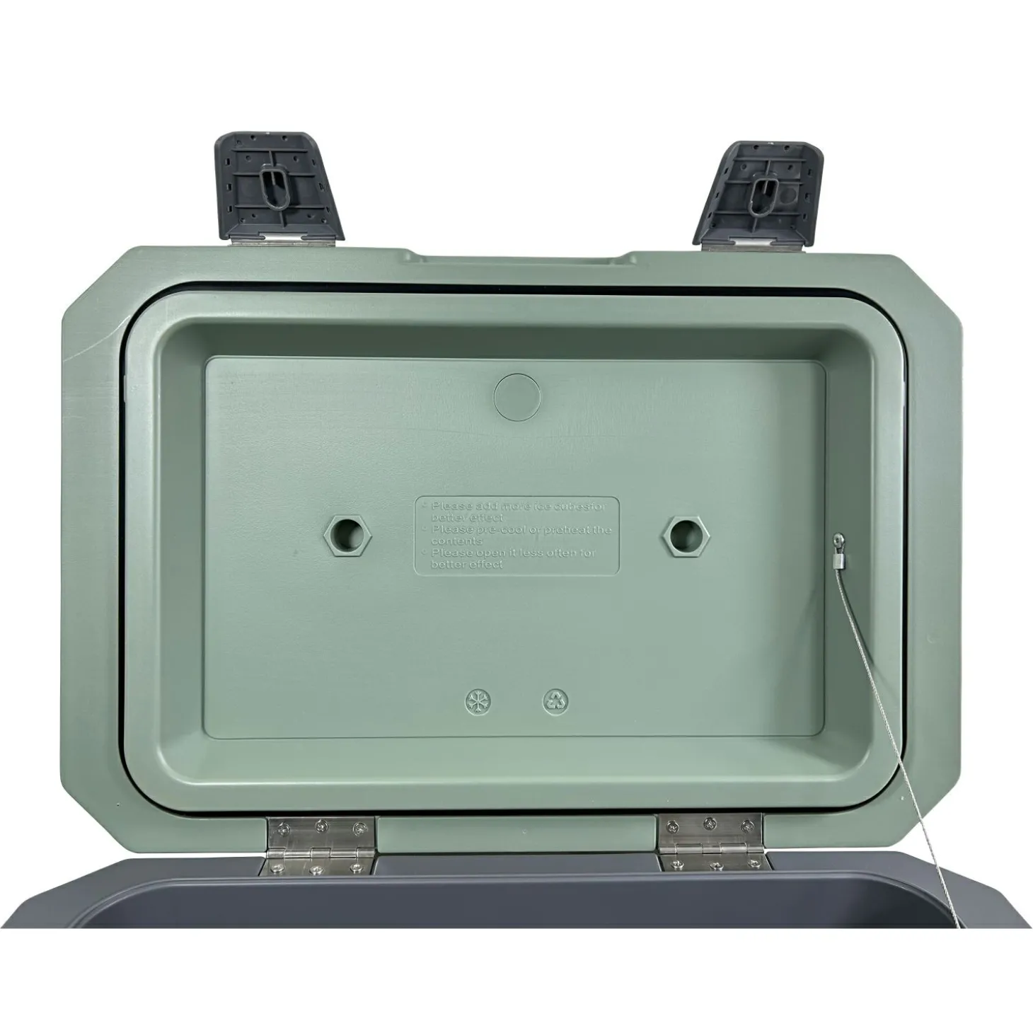 Der Deckel der Kühlbox ist mit großen und starken Scharnieren ausgestattet, die eine sichere und dichte Verschließung gewährleisten. Dies sorgt dafür, dass die Kälte im Inneren bleibt und Ihre Lebensmittel optimal geschützt sind. Eine praktische Ablassöffnung ermöglicht ein einfaches Entleeren von Schmelzwasser, was die Reinigung der Kühlbox erheblich erleichtert.
