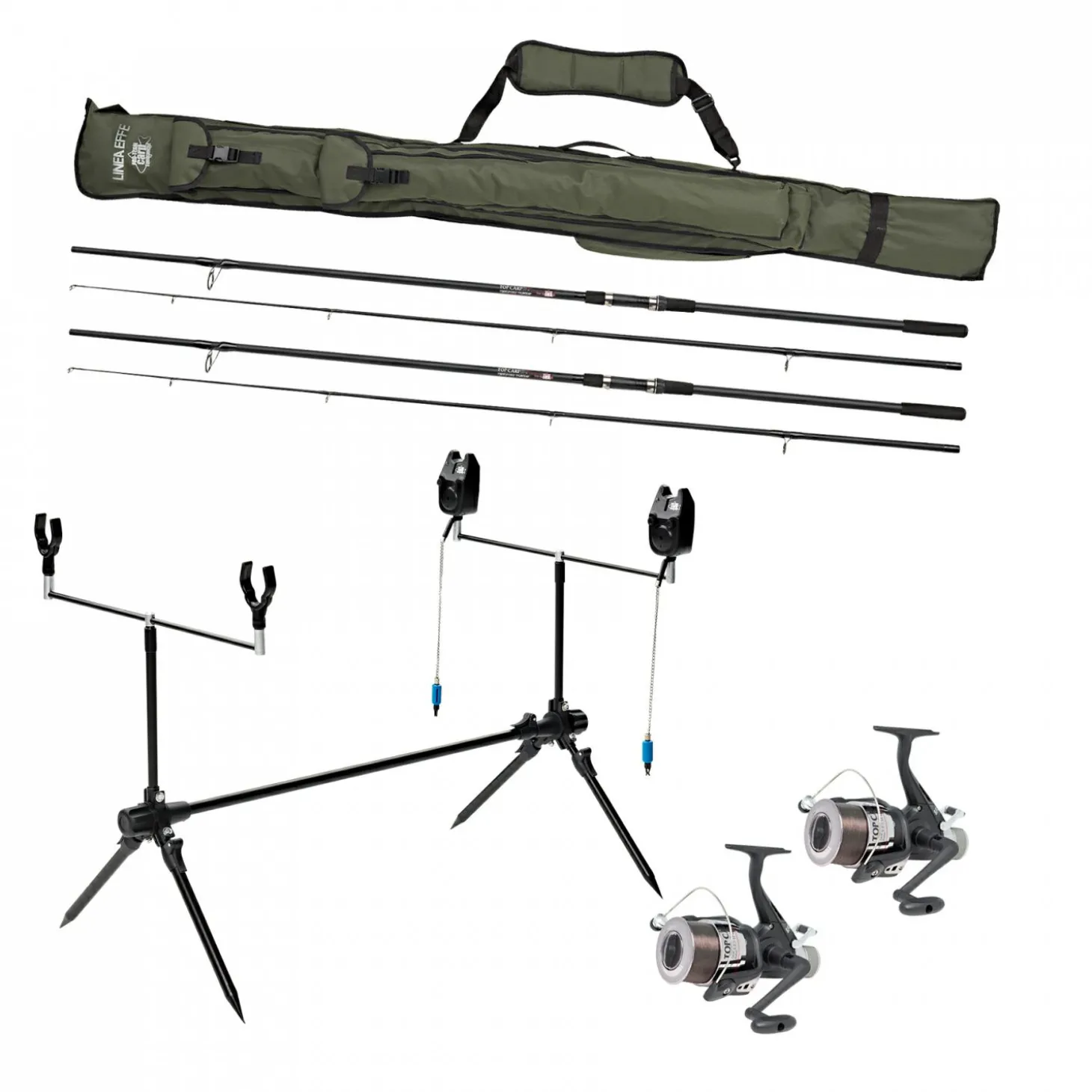 2 x Rute: Länge: 3,6 m, Teile: 2, Wurfgewicht: 2,75 lbs. 2 x Freilaufrolle, bereits bespult: Schnurfassung m / Ø mm: 80-150 / 0,60-0,45, Übersetzung: 5,2:1, Gewicht: 420 g, 1 Kugellager. 1x Rod Pod: Höhe und Breite von 44-54 cm und 78-132 cm einstellbar. 2x akustischer Bissanzeiger mit Swinger: benötigen jeweils eine 9 V Blockbatterie (bitte separat bestellen. 1 Holdall: Zur Aufbewahrung der vormontierten Ruten im Hauptfach plus Seitentaschen für das weitere Zubehör. Mit einer extra Tasche für Ihren Schirm oder sonstigem Carp Tackle. Länge: 195 cm.
