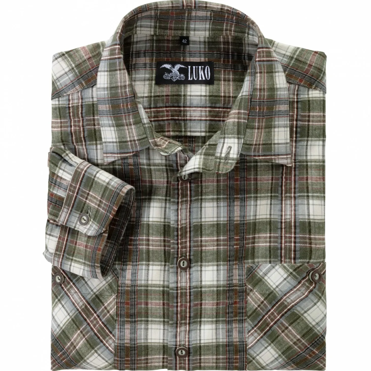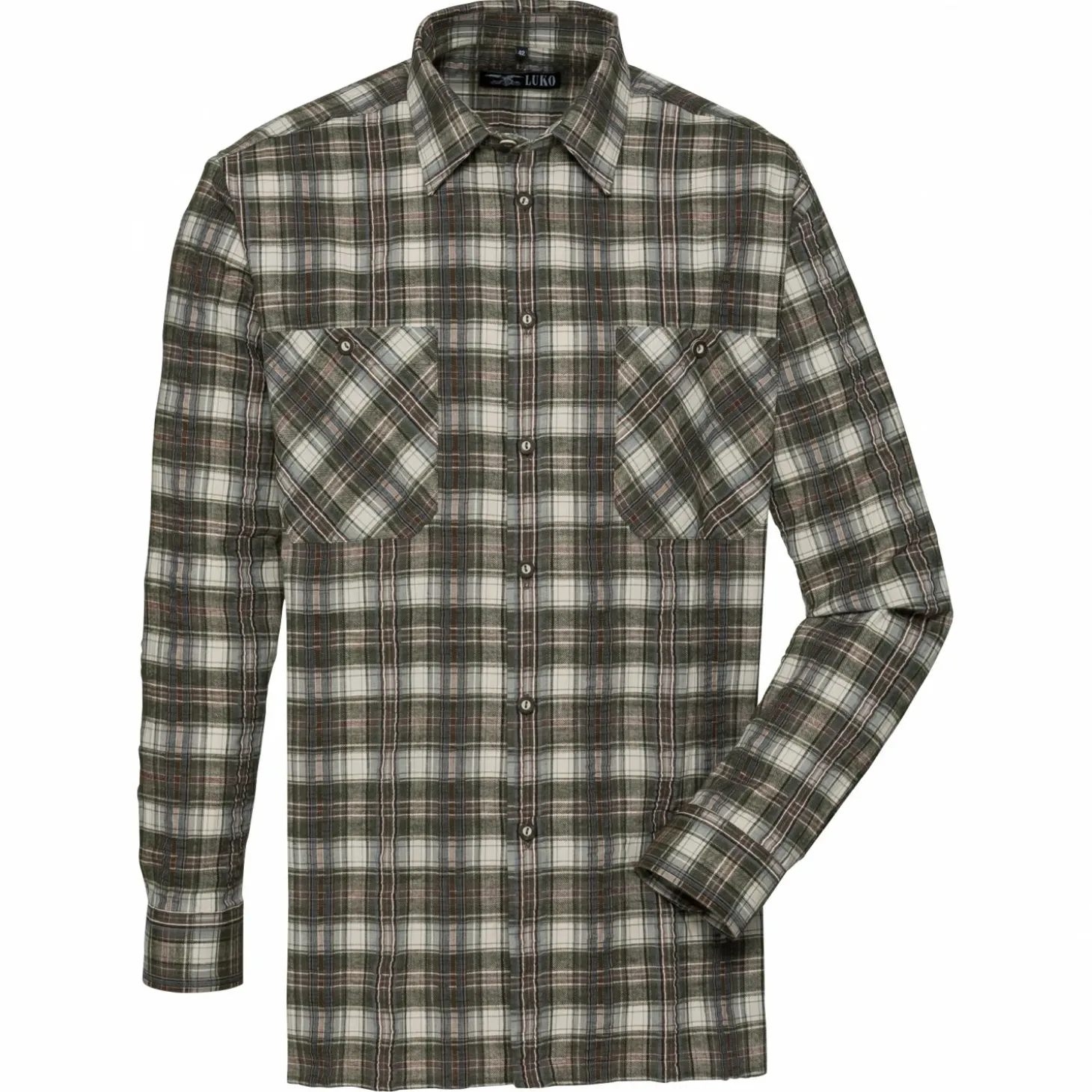 Hochwertiges Langarmhemd im Karo Design mit Knöpfen aus Hirschhorn-Imitat. Das Hemd hat eine linke Brusttasche mit Knopf. Farbe: khaki/weiß.