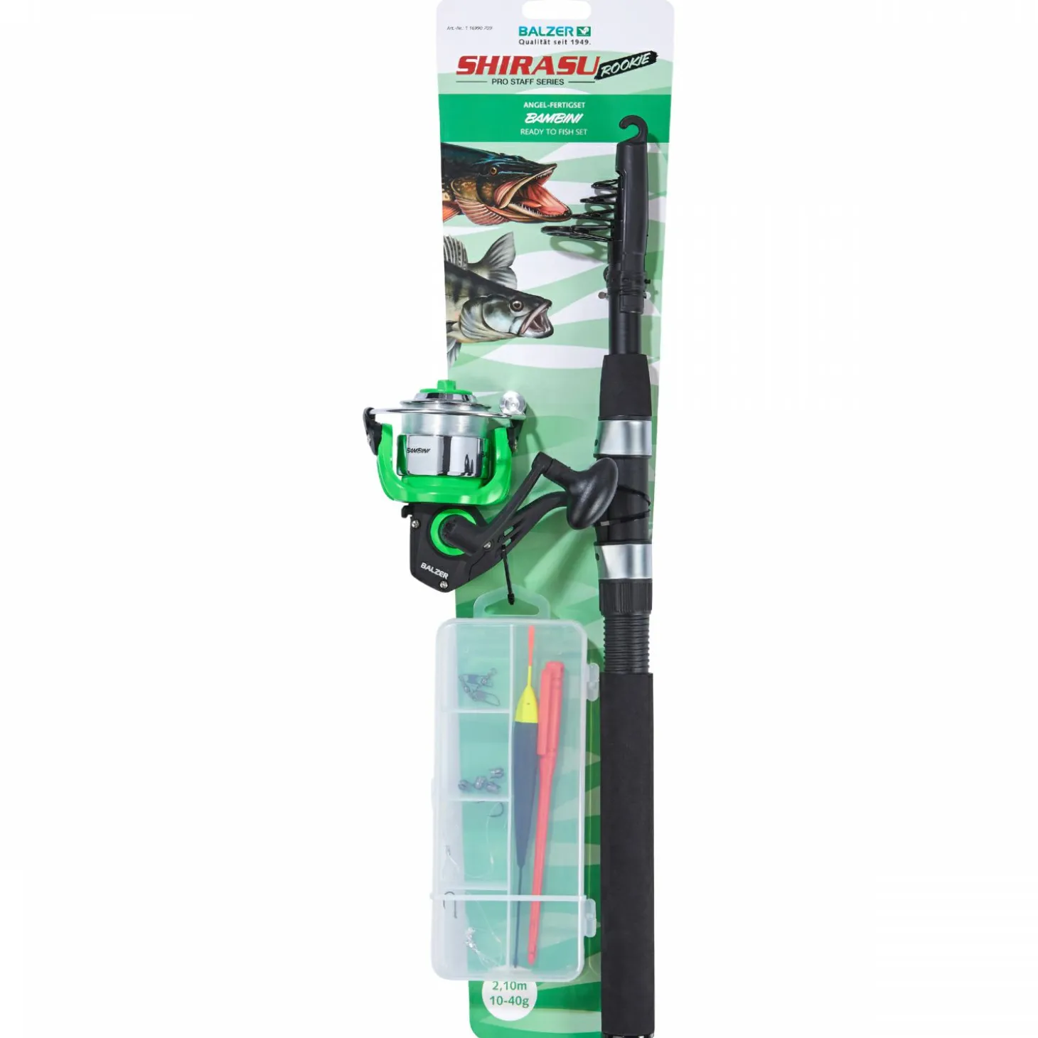 Die Shirasu Rookie Combos sind Komplettsets, die alles liefern, was Angelanfänger brauchen, um direkt erfolgreich zu starten. Die Sets umfassen eine robuste, hochverdichtete Glasfaser-Telerute, die durch ihre Flexibilität und Haltbarkeit überzeugt. Die 1-Kugellagerrolle mit Edelstahl- und Nylon/ABS-Rollenhalter ist bereits werkseitig mit hochwertiger Schnur bespult, damit sofort mit dem Angeln begonnen werden kann. Eine praktische Tackle-Box mit passendem Kunstköder-Zubehör rundet das Set ab und sorgt für eine optimale Ausrüstung ohne zusätzlichen Aufwand. Die Rute verfügt über feine Duplongriffe, die für angenehmen Halt und gute Kontrolle sorgen.