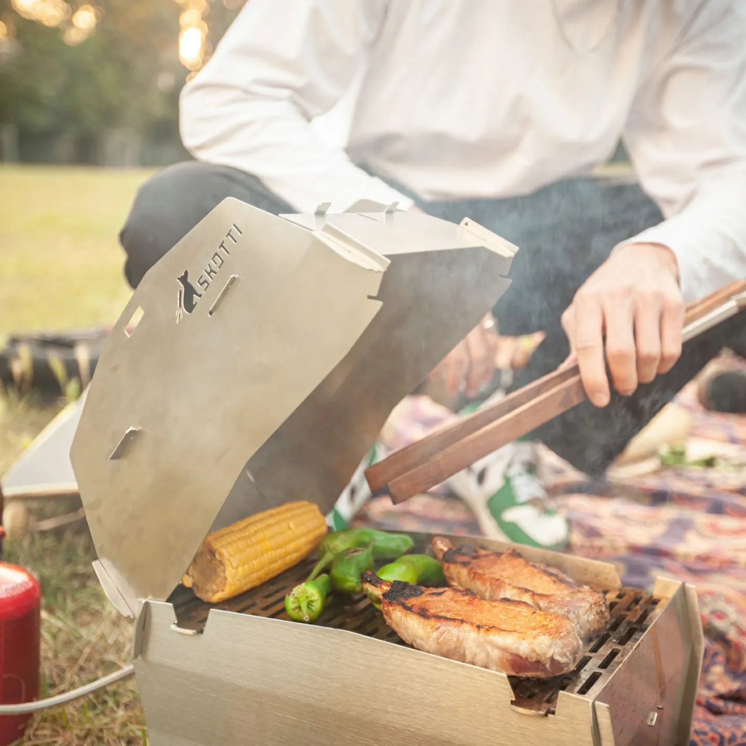 Ein praktisches Detail: Der Griff der Skotti Cap dient zugleich als Grillzange. Dank Aussparungen in den Seitenteilen lässt sich das Bambusholz der Zange einstecken, wodurch der Deckel sicher angehoben werden kann. Zusätzlich ist im Aluminiumkopf der Zange ein Flaschenöffner integriert.