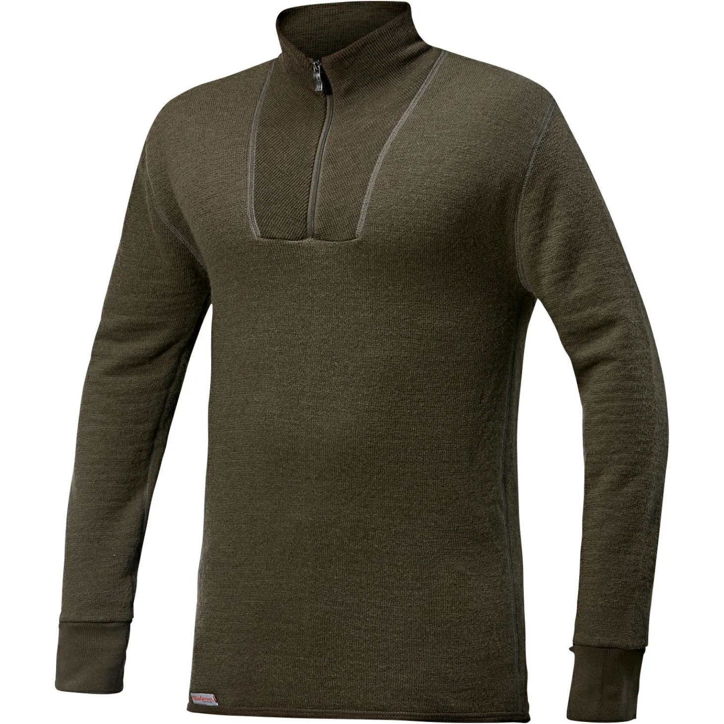 Dieses warme Shirt mit Kragen und kurzem Reißverschluss wurde rundgestrickt und hat daher keine Längsnaht. Mit verlängerter Rückenpartie und eingestrickten Bündchen. Farbe: grün.