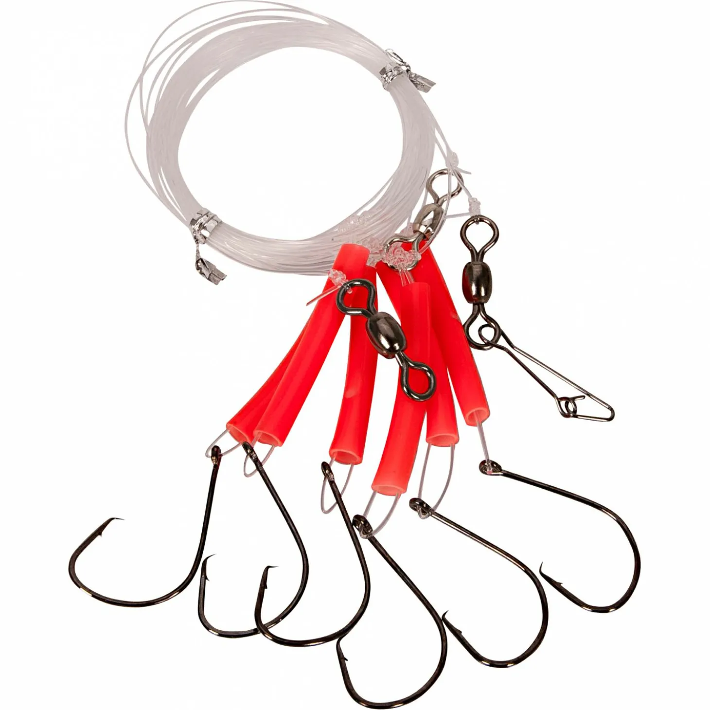 6 Meter langes Rotbarsch-System mit 6 Circle Hooks an Monofilschnur. Fluo-Schlauch erzeugt zusätzliche Lockwirkung. Durch Wirbel getrenntes Vorfach beugt Verwicklungen vor. Inhalt: 6 Stück.