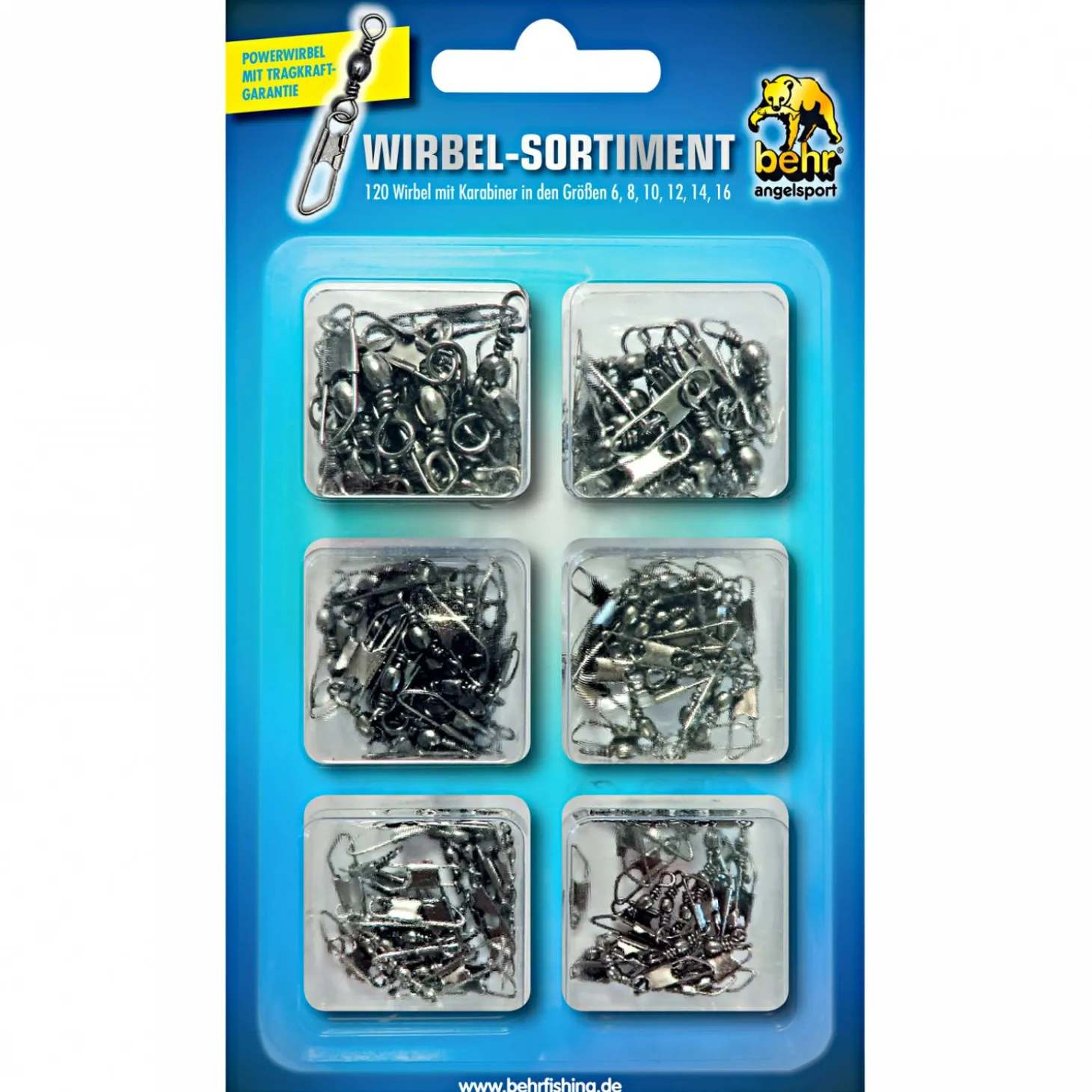 Tönnchenwirbel mit Karabiner sortiert, je 20 Stück der Größen 6, 8, 10, 12, 14, 16. Inhalt: 120 Stück.