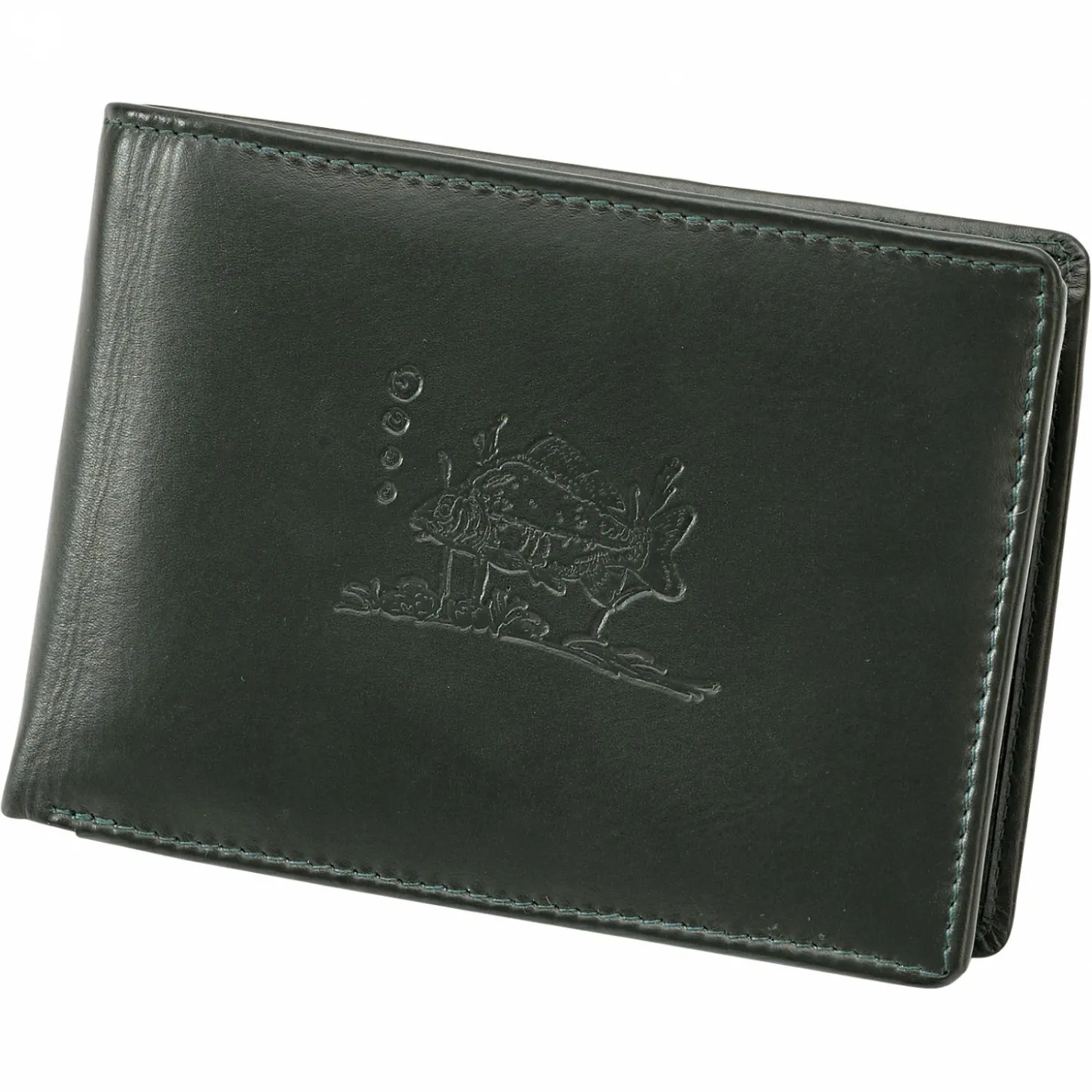 Vielseitige, aus Rindsleder gefertigte Geldbörse mit eingestanztem Karpfen-Motiv. Praktisches Klappdesign, 6 Kartenfächer, 2 Steckfächer, 2 Scheinfächer, je 1 Fenster- und Münzfach. Auch eine tolle Geschenkidee! Maße: 12,5 x 9 x 2 cm. Farbe: dunkeloliv.