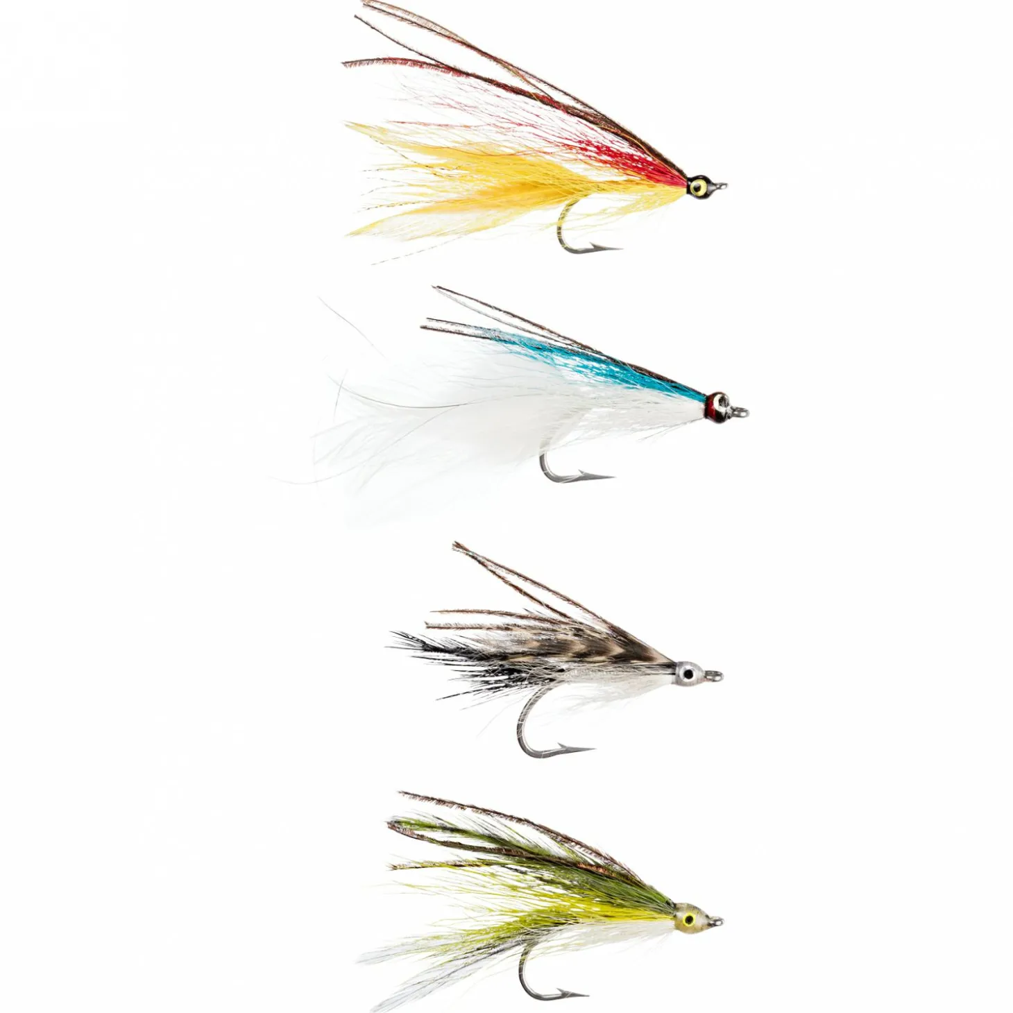 4 professionell gebundene Salzwasserstreamer in den Farbvarianten Black, Blue/White, Green und Red/Yellow. Ideal für Meerforellen.