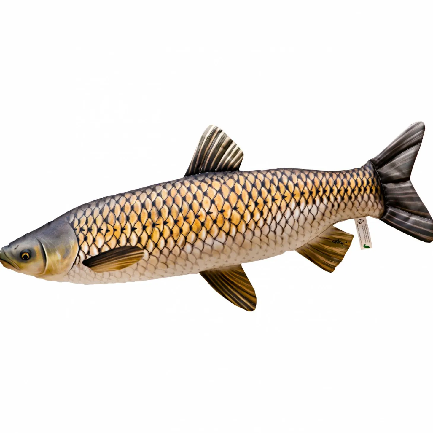 Weiche Graskarpfen-Imitation in charakteristischer Farbe und Form, ideal als Kuscheltier oder Kissen. Länge: ca. 105 cm. Hergestellt unter Beachtung der europ. Sicherheitsnorm EN 71. Achtung: Nicht für Kinder unter 3 Jahren geeignet.