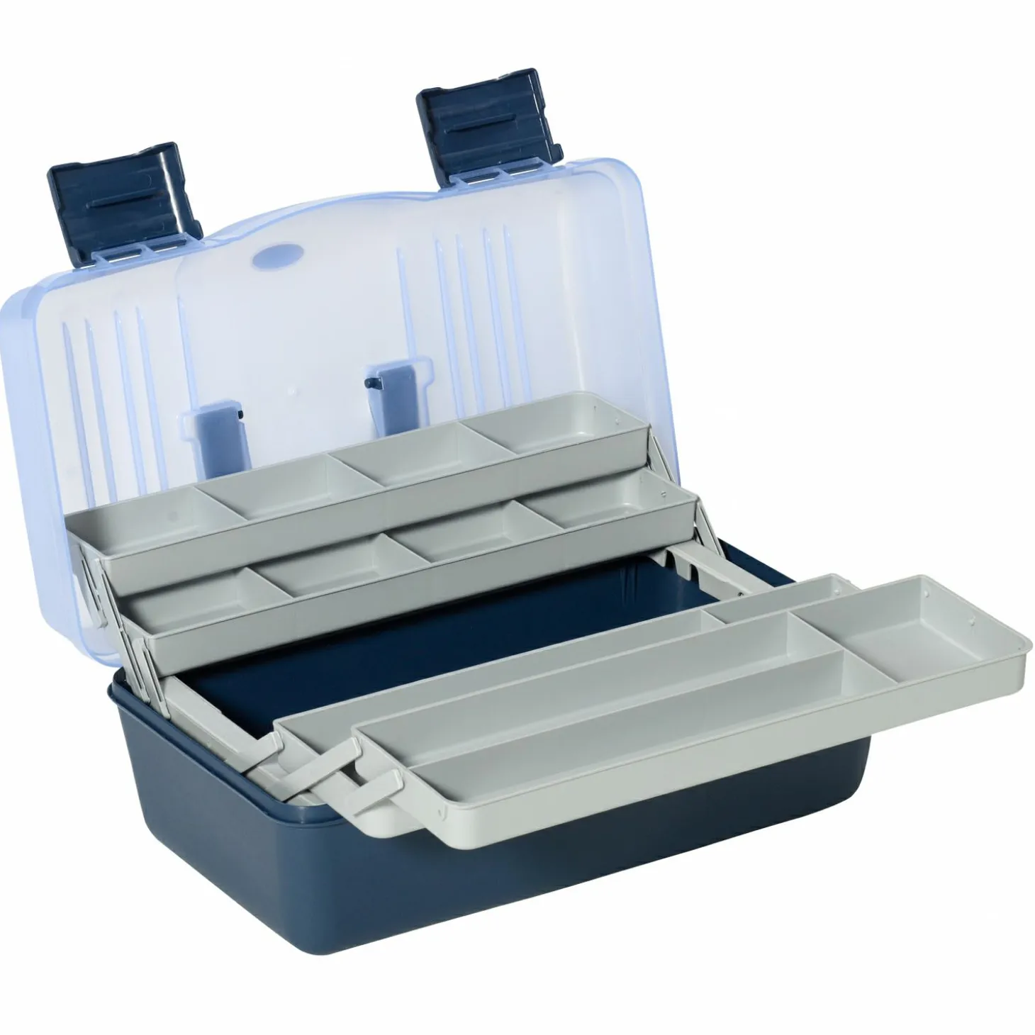 Gerätekoffer mit 4 Klappladen. Die stabilen Schnappverschlüsse und der Tragegriff ermöglichen einen leichten Transport. Farbe: blau/klar. Maße ca. 46,0 x 25,5 x 20,5 cm.