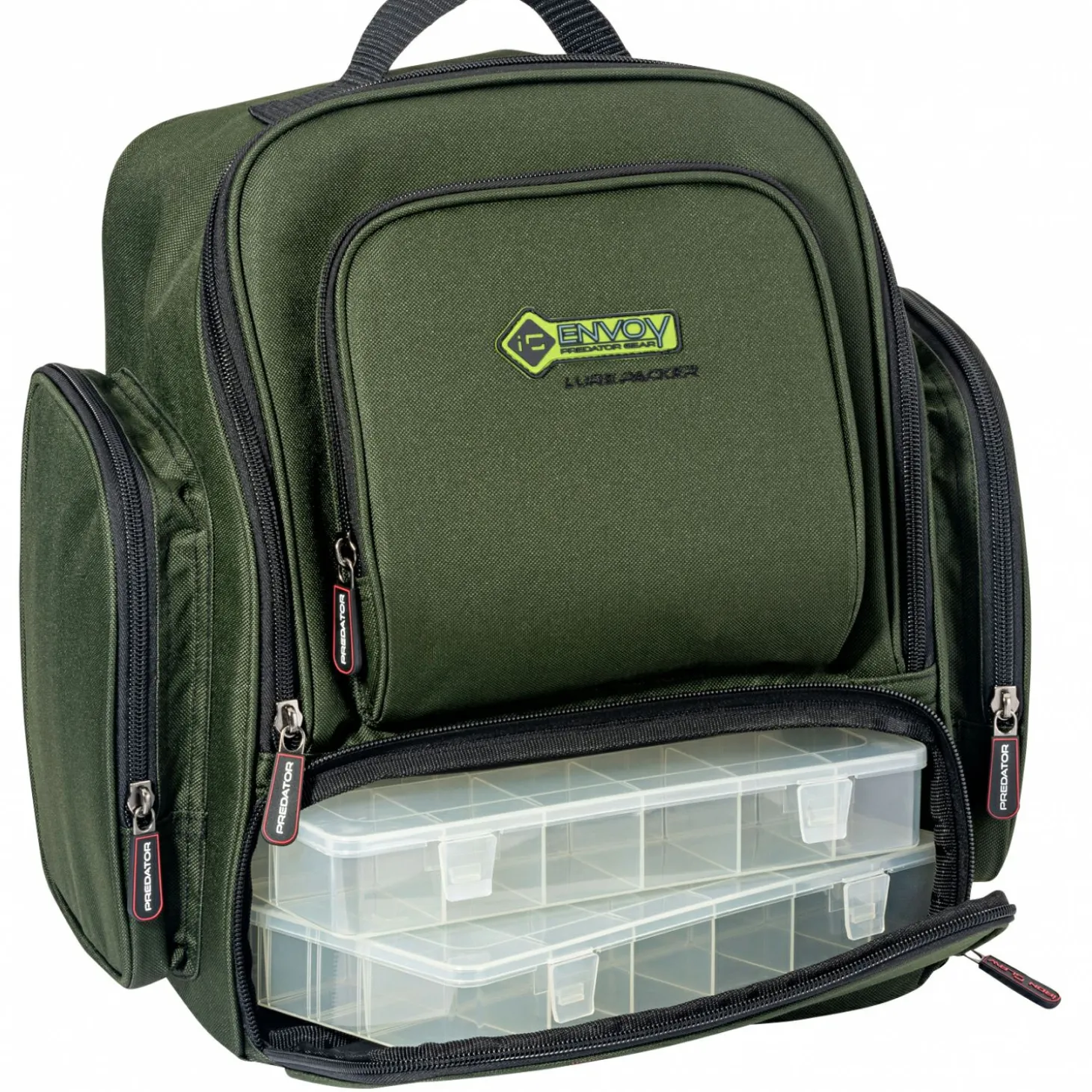 Im separaten Frontfach befinden sich zwei mitgelieferte Vario Box 275, die einen schnellen Zugriff auf Köder und Kleinteile ermöglichen. Eine zusätzliche aufgesetzte Fronttasche bietet Platz für Werkzeuge, Vorfächer oder Angelpapiere, die griffbereit verstaut werden sollen.