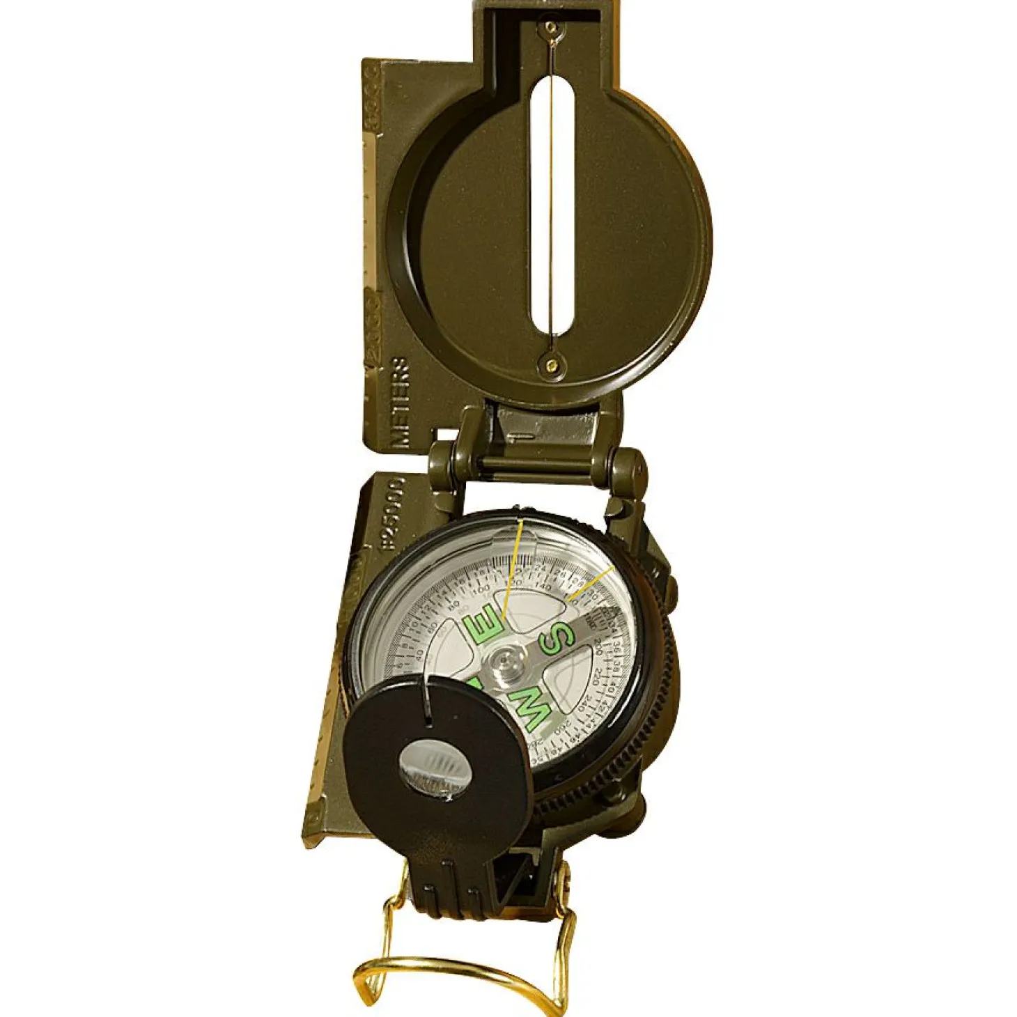 Kompass mit stabilem Metallgehäuse, für den harten Einsatz im Gelände. Weitere Merkmale sind: seitliche Maßeinteilung, Vergrößerungsglas im Sucher und Leuchtmarkierungen. Durchmesser ca.: 5,5 cm. Gesamtlänge ca.: 17,0 cm aufgeklappt.