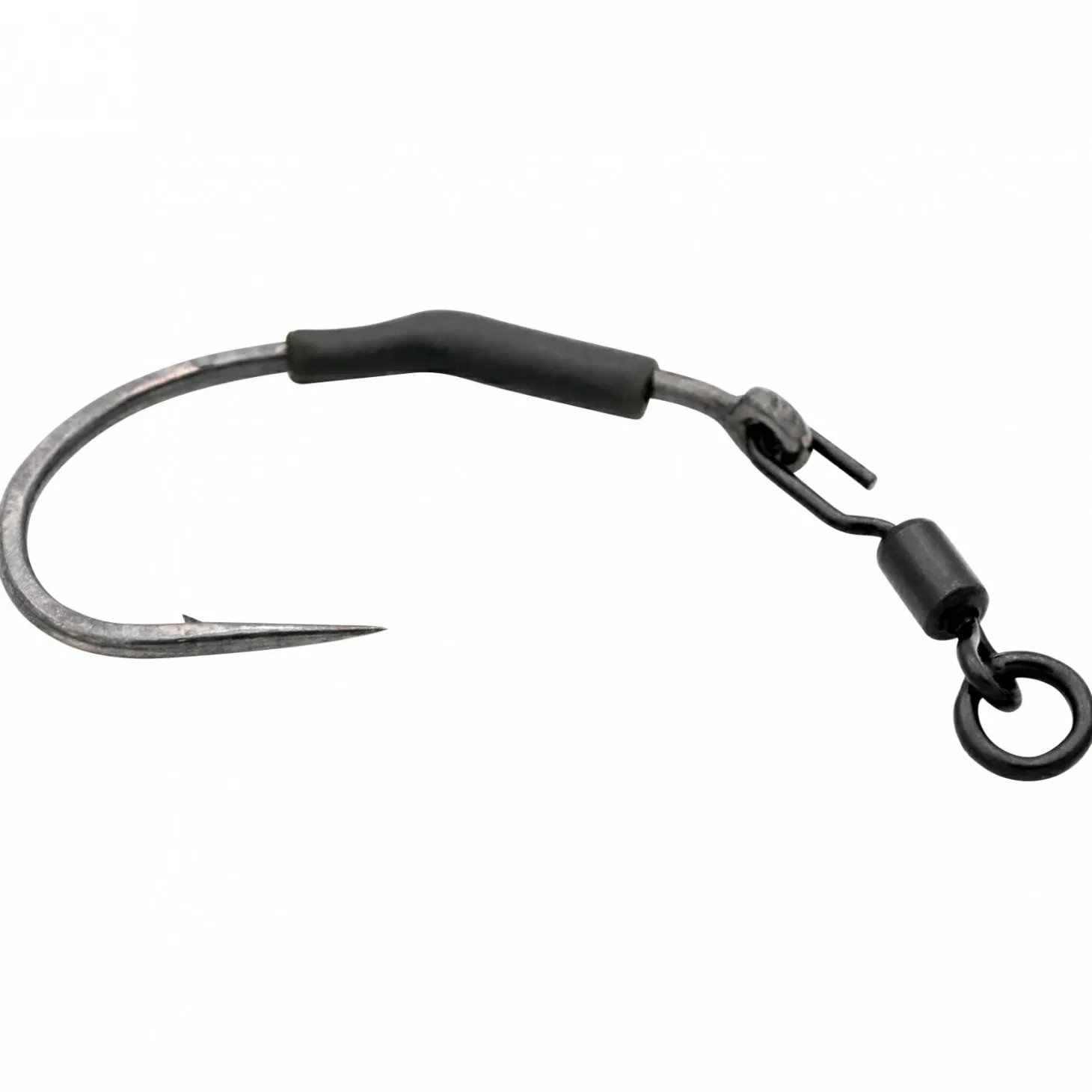 Früher musste man bei der Verwendung eines Spinner-Rigs oft eine Zange benutzen, um einen QC-Swivel oder ähnliches zu öffnen und den Haken darauf zu klemmen, aber diese Swivel haben eine gekrümmte Öffnung, auf die der Haken einfach aufgeschoben werden kann, und dann wird ein Stück Schrumpfschlauch oder ein mittlerer Kicker verwendet, um die Verbindung abzudecken und alles an Ort und Stelle und im richtigen Winkel zu halten.