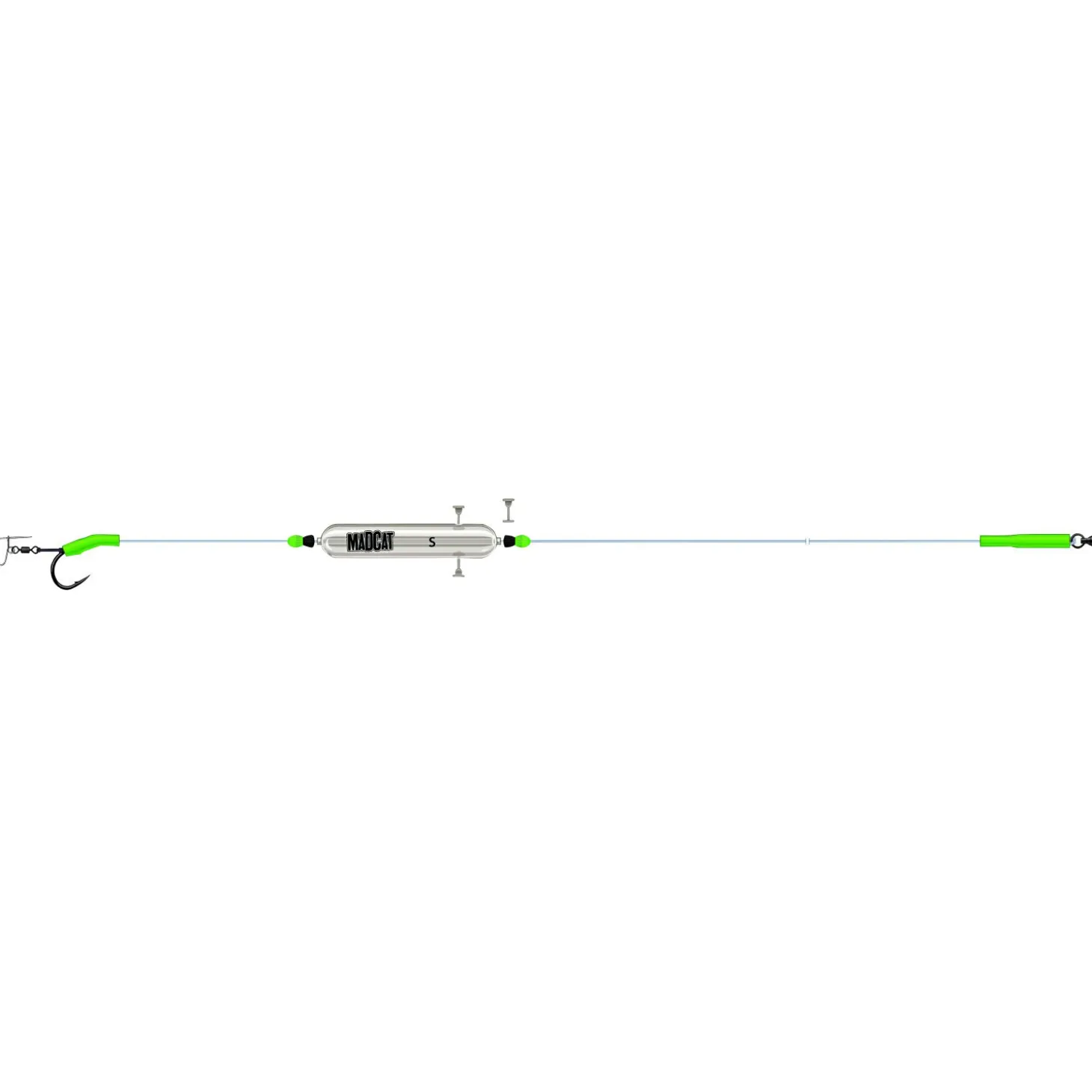 Der große Vorteil des Nasenclips besteht darin, dass der Einzelhaken sauber freiliegt, was zu einer höheren Hook-Up-Rate führt. Gebunden mit 1,3 mm dickem MADCAT Ultra-Soft Monovorfach. Die Gesamtlänge des Rigs beträgt 250 cm, während die Bruchlast 165 Pfund beträgt.