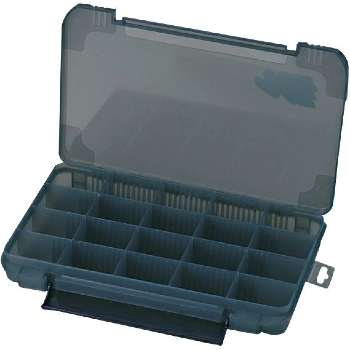 Die frei eintalbare Köderbox ist groß und gleichzeitig mit einer Hand bedienbar. Maße: 35,6 x 23,0 x 5,0 cm.