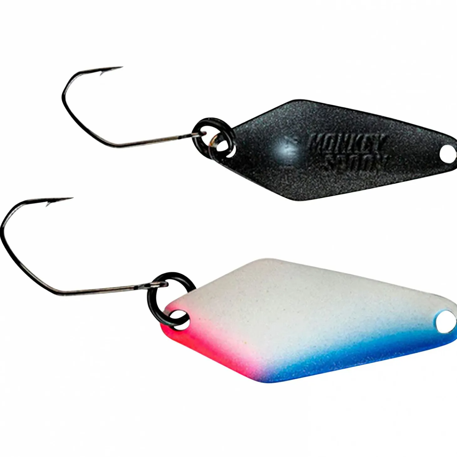 Ihr Design sorgt außerdem für einen gewissen „An-Aus-Effekt“ im Wasser, hervorgerufen dadurch, dass die Seiten der einzelnen Köder unterschiedlich designt sind. So entsteht ein gleich doppelter Lockeffekt für Salmoniden, zum einen dank der genannten visuellen Reize, als auch durch die Druckwellen, die der Spoon erzeugt. Um ein langes Suchen zu verhindern wurde auf der Rückseite ein Gewicht eingestanzt. Die Monkey Spoons sind speziell anhand der Bedingungen an Forellenseen entwickelt worden und das spiegelt sich auch in dem verwendeten Haken wieder, welcher eigens von Monkey Lures produziert wurde.