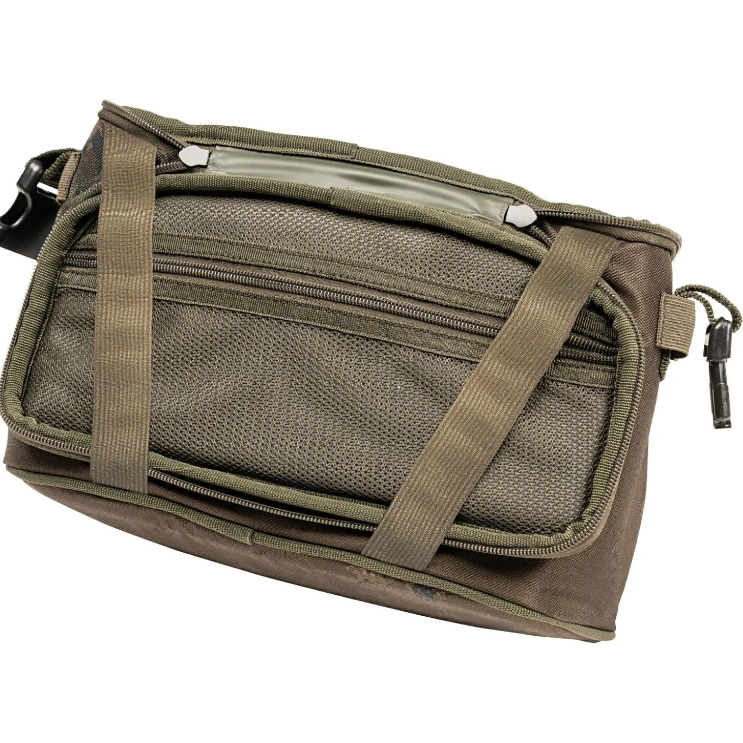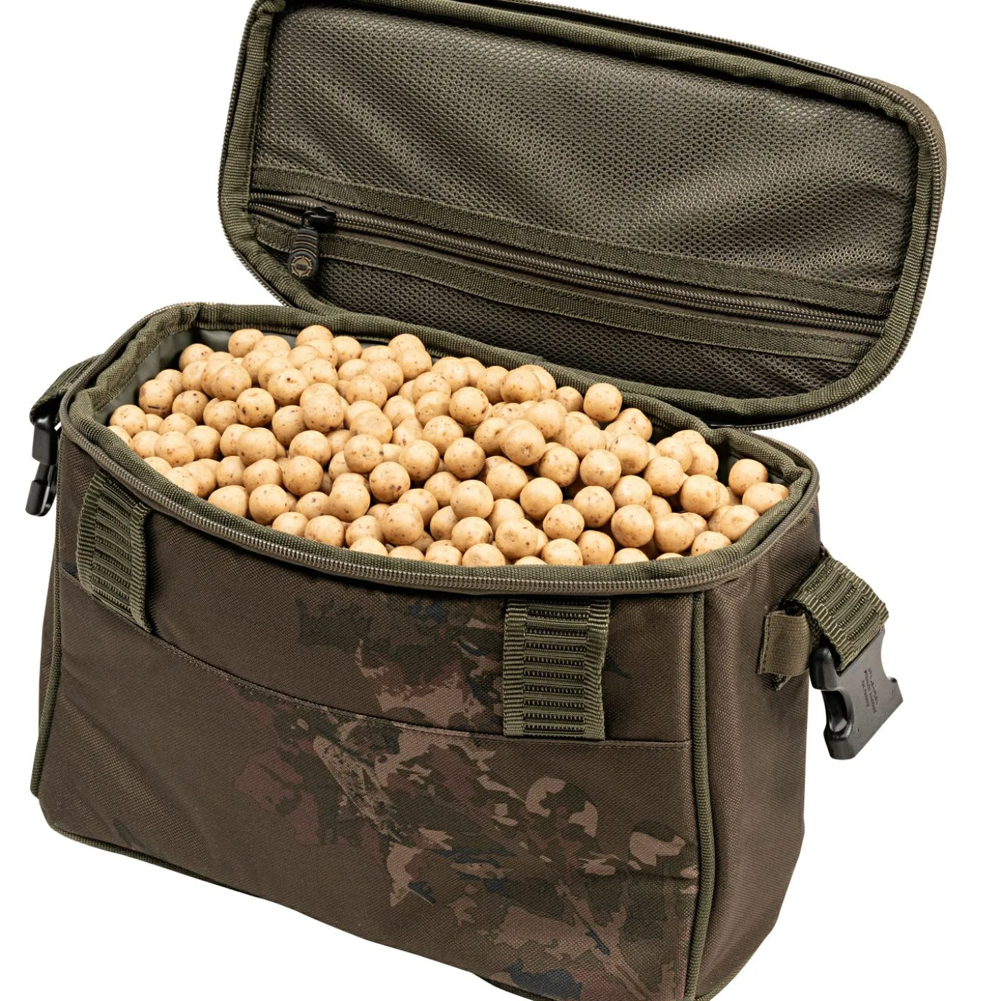 Die Nash Scope Baiting Pouch ist das ideale Zubehör für flexible Futterstrategien beim Floaterfischen oder Stalking. Sie kann dank verstellbarem Gurt bequem über der Schulter getragen oder an den Gürtelschlaufen befestigt werden und ist so jederzeit schnell einsatzbereit. Das vordere Reißverschlussfach öffnet sich von dir weg und bleibt durch elastische Sicherungen dauerhaft offen, ohne während der Nutzung ständig geschlossen werden zu müssen. Elastische Schlaufen bieten Platz für Futterschleudern oder Wurfrohre, während ein inneres Netzfach unter dem Deckel TT und Zubehör organisiert aufnimmt. Die abwischbare PVC-Innenbeschichtung erleichtert die Reinigung. Mit einem Fassungsvermögen von ca. 3,5 kg Boilies ist die Tasche optimal für mobiles und gezieltes Füttern geeignet.