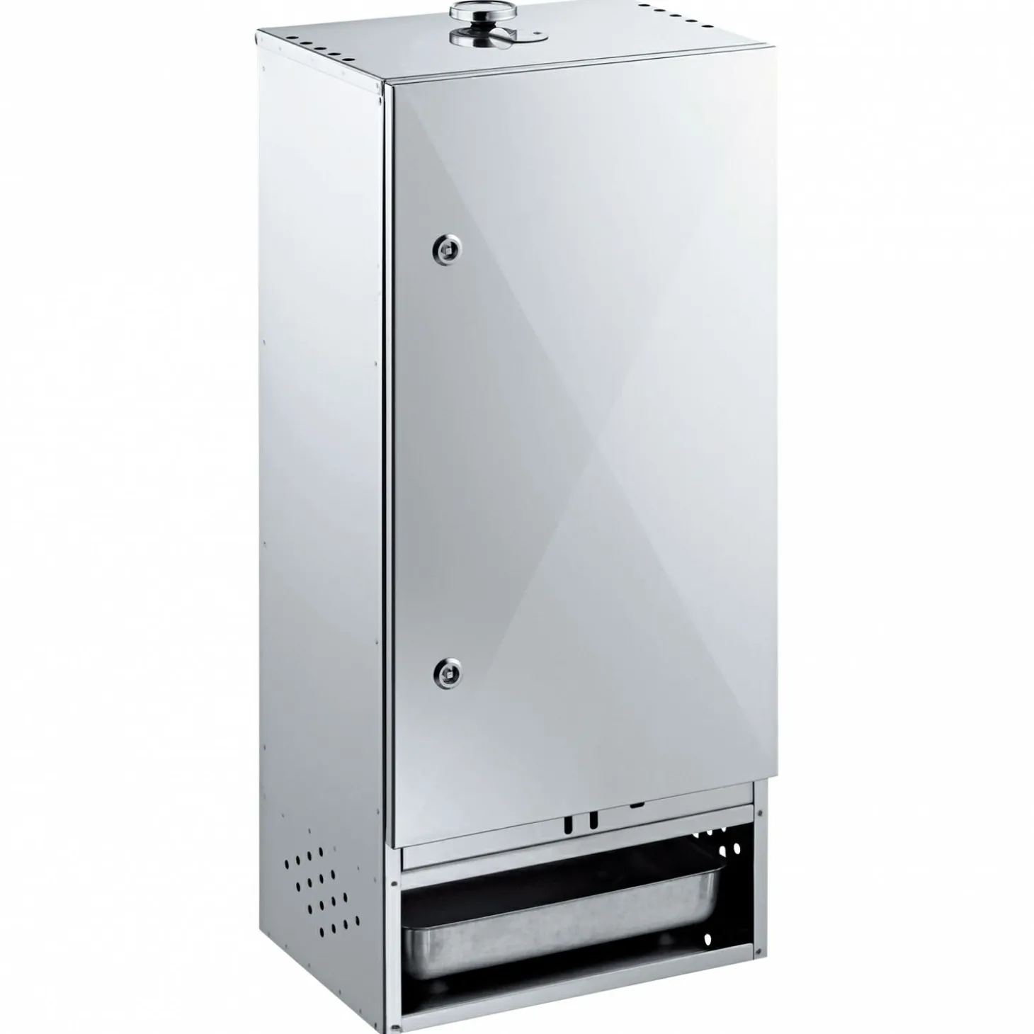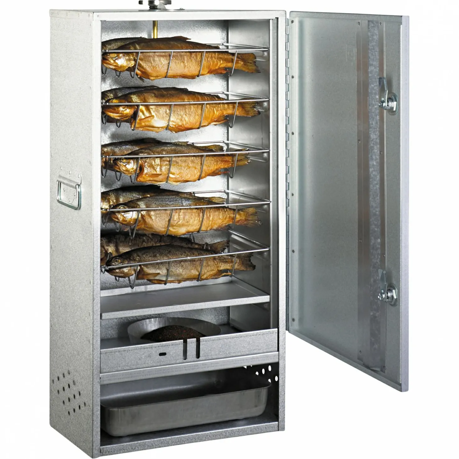 Hochwertiger Räucherofen mit Tür und reichhaltiger Grundaustattung wie: 1 Glutkasten, 1 Tropfwanne, 1 Räuchermehl-Schale, 1 Thermometer, 1 Rost mit Stäben zum Senkrechträuchern, 1 Beutel Räuchermehl (500 g), 1 Fischkörbchen, 1 Flachrost, 3 S-Haken. Wahlweise aus aluminiertem Stahlblech oder rostfreiem Edelstahl gefertigt.