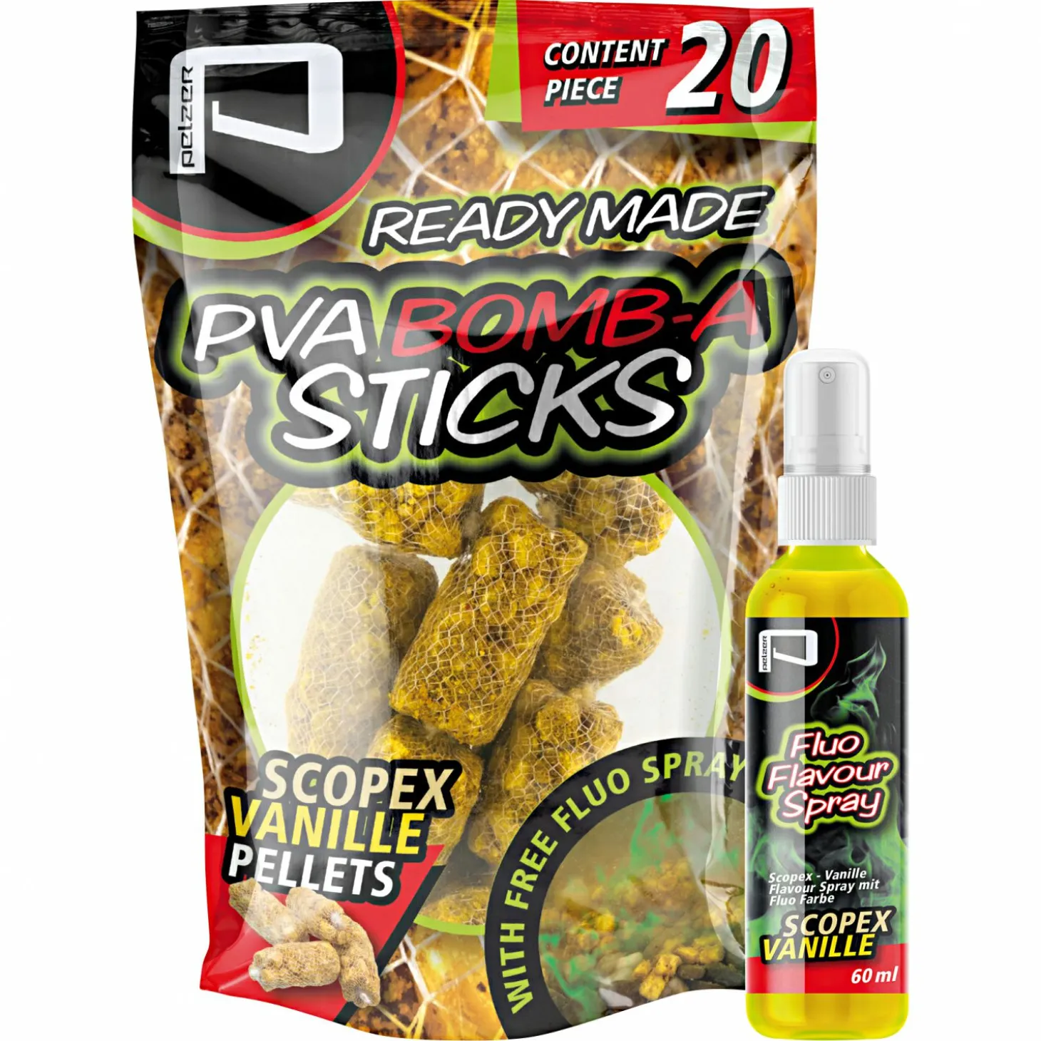 Mit Pellets- und Groundbait-Füllung, Art. 190349-190351 inkl. 60 ml Flavour-Spray mit Fluo-Farbe, für maximalen Lockeffekt. Inhalt. 20 Stück.