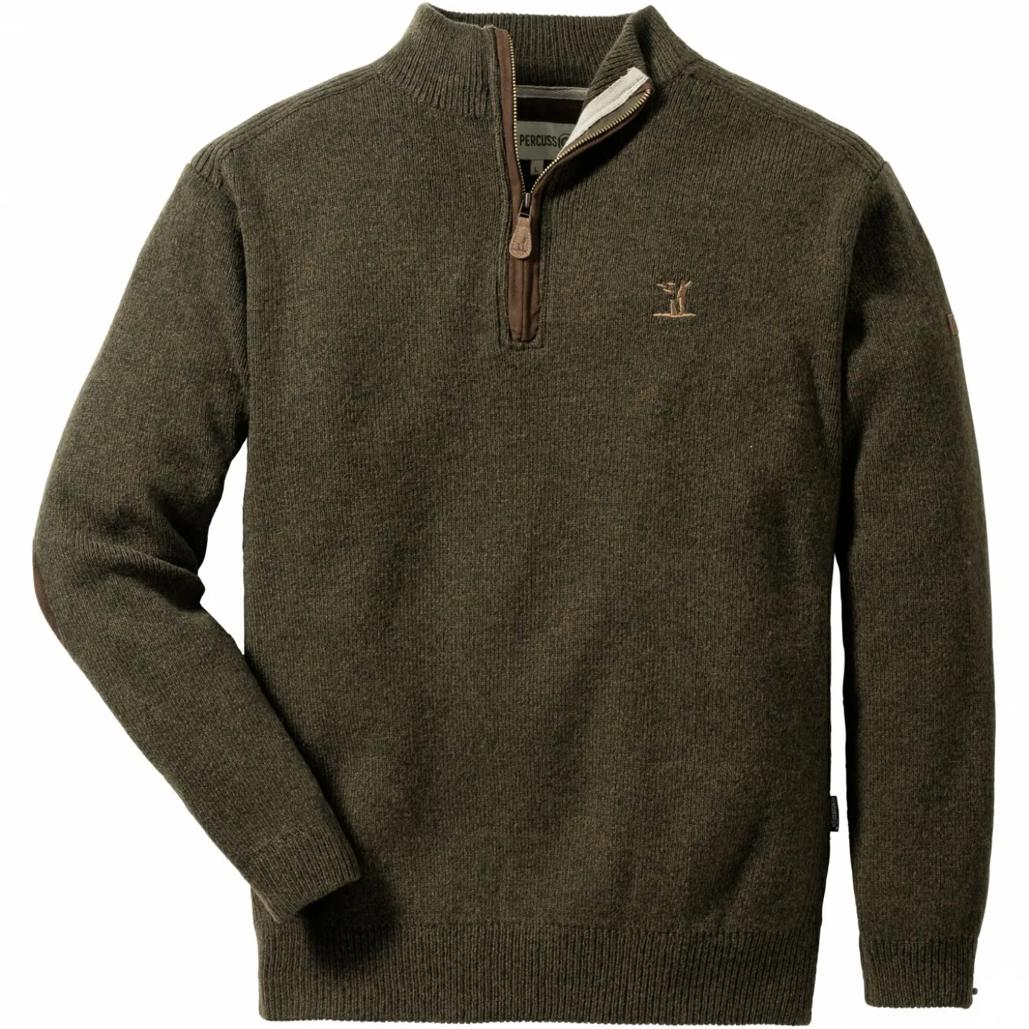Percussion Sweater mit Zipper im jagdlichem Design mit bequemem Troyer-Kragen und edler Stickerei auf der Brust. Das angenehme Material und der gerade Schnitt gewährleisten idealen Tragekomfort. Farbe: grün.