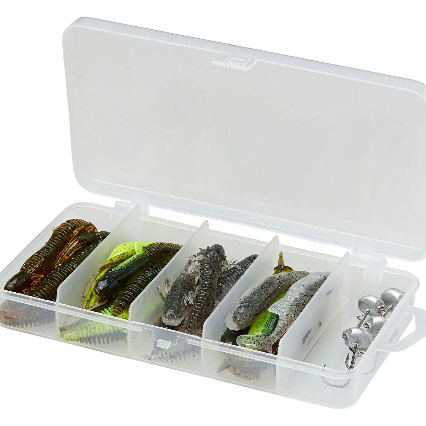Bestehend aus 24 x schwimmende Duratex-Net-Köder: 7,5 cm Salamander, 7,0 cm Grundel, 7,5 cm Elritze, 7,5 cm Dragon Tail (2 von jeder Farbe: Green Pumkin, Chartreuse Pumpkin, Holo Baitfish) und 4 Jigköpfe Hakengr. 1 in 5 g, 9 g und 2 x 7 g.