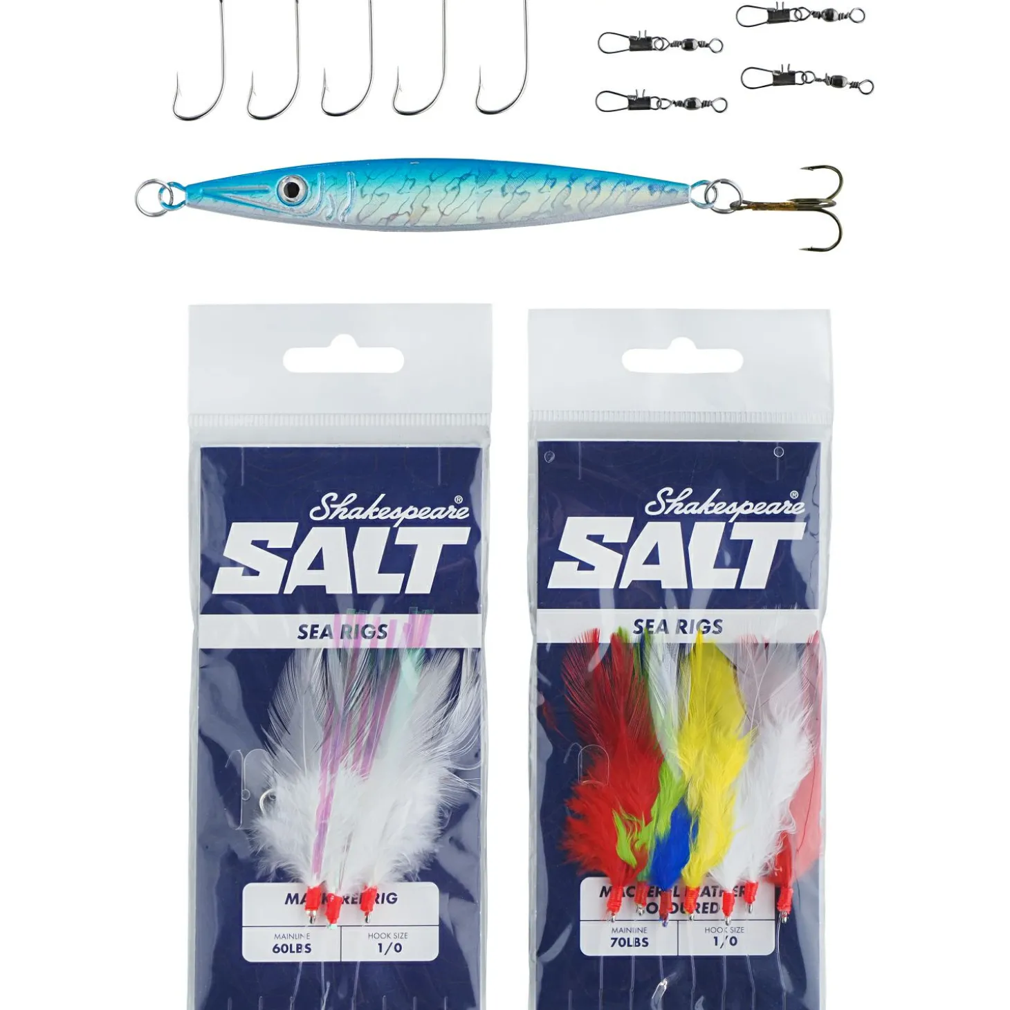 Die Shakespeare SALT Boat Basher Combos sind sofort einsatzbereite Sets für Angler, die das Bootsangeln ausprobieren möchten, ohne dabei hohe Kosten einzuplanen. Die robusten Glasfaserruten sind mit langlebigen Edelstahlringen ausgestattet und verfügen über einen ergonomisch geformten, hochverdichteten EVA-Griff für sicheren Halt. Die leistungsstarke Graphitrolle ist bereits mit hochwertiger Monofilschnur bespult und bietet genügend Kraftreserven, um auch größere Fische zuverlässig einzuholen. Abgerundet wird das Set durch eine umfangreiche Tacklebox mit allem wichtigen Zubehör für den Bootsausflug, darunter ein Pilker, Makrelenvorfächer, Wirbel und Ersatzhaken.