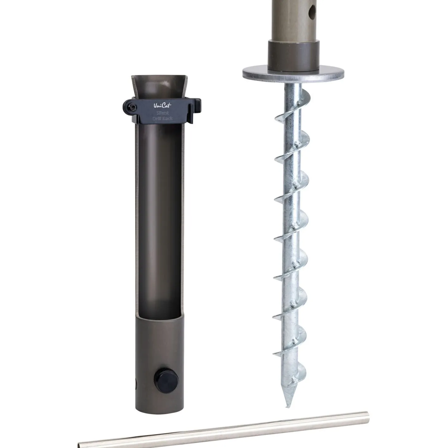 Kann nahezu lautlos im Boden befestigt werden. Aus robustem Aluminium und mit einer Rückschlagsicherung versehen. Richtung der Rute kann dank „Never Lost“ Schraube verstellt werden. Länge: 76 cm. Transportlänge: 45 cm. Gewicht: 1,8 kg.